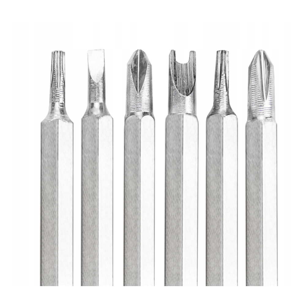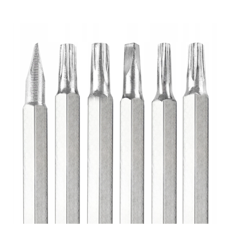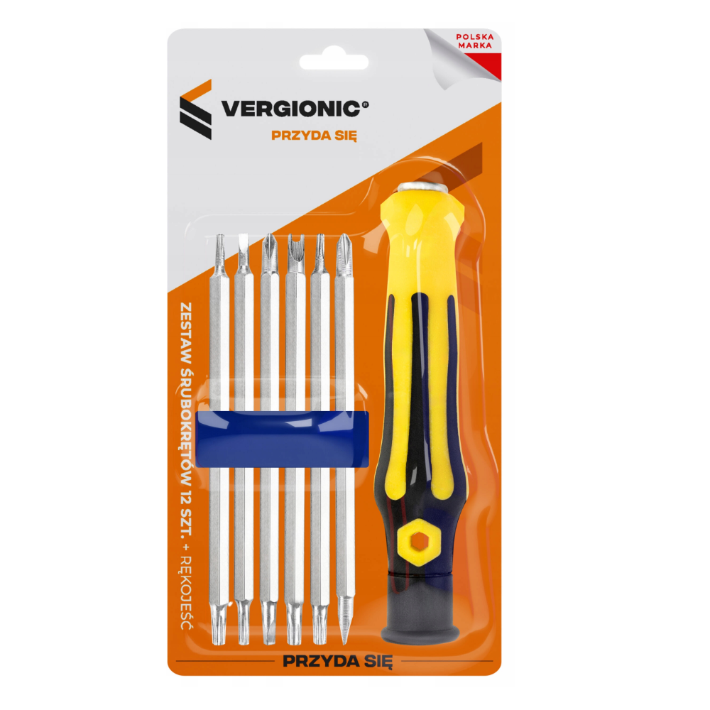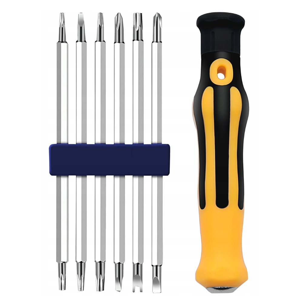 Zestaw śrubokrętów składający się z różnych bitów oraz rękojeści.
